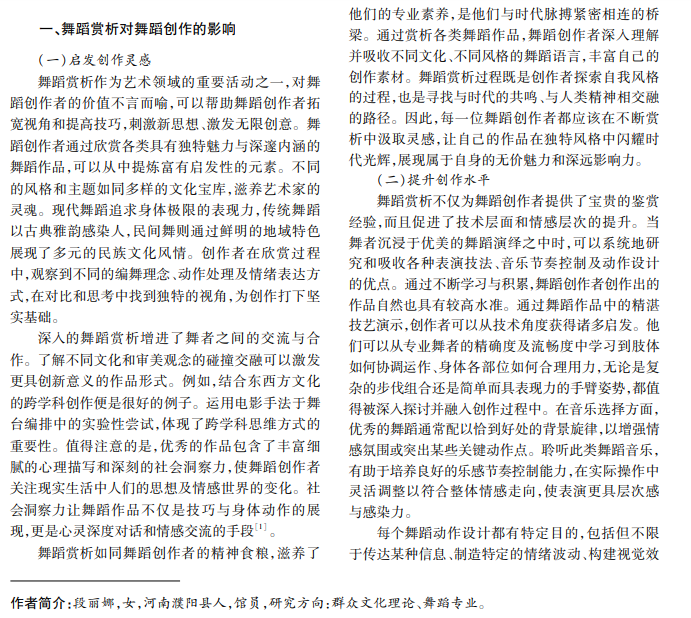 舞蹈作为一种艺术形式,以身体语言传达情感、故事和美学意义。舞蹈融合了音乐、灯光和服装等 多种元素,创造引人入胜的艺术体验。舞蹈赏析与舞蹈创作相辅相成、相互影响。舞蹈赏析有助于舞者和编舞 者理解不同风格和技巧,舞蹈创作可以激发赏析者对舞蹈的深层理解和欣赏。舞蹈赏析与舞蹈创作相互交织, 推动舞蹈艺术繁荣发展。