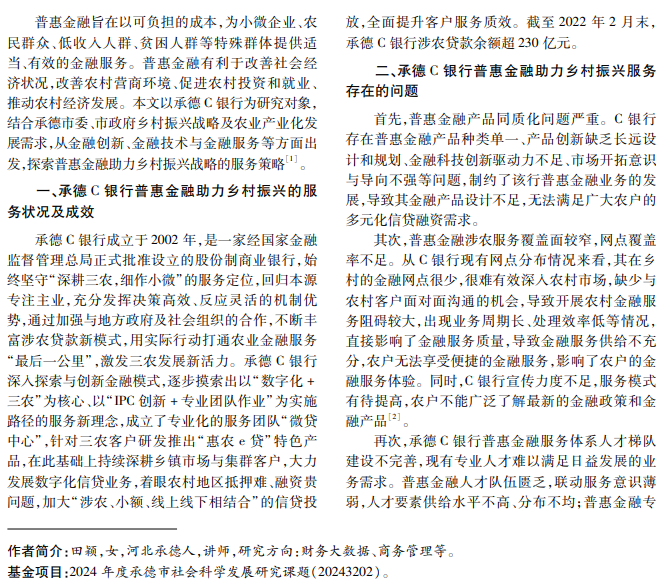 在农业现代化转型的过程中,乡村基础设施、公共服务、生态环境等方面的问题,直接影响乡村振 兴战略实施效果。普惠金融作为金融服务的重要组成部分,为经济发展提供有力的金融支持,对农业产业结构 优化调整产生积极影响。本文研究承德 C银行普惠金融赋能乡村全面振兴情况,分析存在的问题和原因,结合 PEST分析、SWOT分析结果,为承德市普惠金融高质量助力乡村振兴提出服务策略。