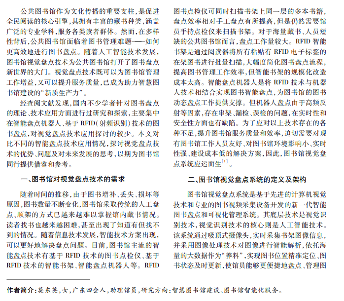 本文通过对比不同智能盘点技术的应用情况,探析图书馆对视觉盘点技术的需求。以四会市图书 馆视觉盘点技术的应用实践为例,探讨视觉盘点技术的优势、在图书馆实际开展盘点工作中遇到的问题及对未 来发展的思考。