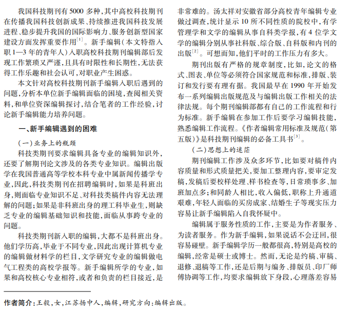 高校科技期刊编辑工作往往各有侧重点,大致可分为编校型、新技术型、为作者和读者服务型、外 联型、学者型。本文分析高校科技期刊新手编辑普遍存在的业务挑战、思想迷茫及工作中经验不足、知识积累不 够等问题,提出新手编辑应根据自身实际,尽早确定编辑职业发展方向,持之以恒地努力,早日成为成熟编辑。