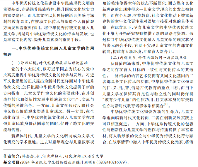 本文从理论研究、实证研究、对策研究三方面探究中华优秀传统文化融入儿童文学的作用机理、实 践现状与对策路径,通过将中华优秀传统文化与现代教育理念相结合,探索儿童文学创作新思路;通过将专业 研究与创意写作相融合,提出专业性强、更具创造力的儿童文学创作方法;通过探索科技创新手段,拓宽中华优 秀传统文化在儿童文学中的传播渠道和应用场景,为其现代传承提供新视角。