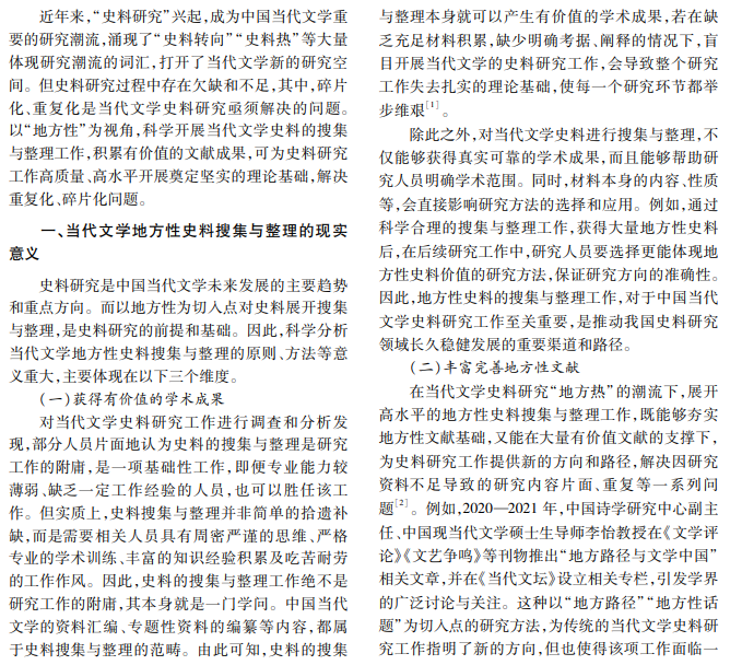 为提高当代文学地方性史料搜集效率和整理质量,促进史料研究持续深化,本文分析其现实意义, 阐述相应措施,旨在推动史料学研究,以供参考。