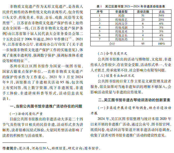 非物质文化遗产是中华优秀传统文化的重要组成部分,是一个国家和民族历史文化成就的重要标 志。公共图书馆作为城市文化传承与知识传播的重要机构,在非物质文化遗产保护传承中扮演重要角色。本 文以吴江区图书馆“融合图书古籍资源 传承优秀古琴文化”公益活动为例,探索公共图书馆如何在非物质文化 遗产保护传承中发挥更大的作用。