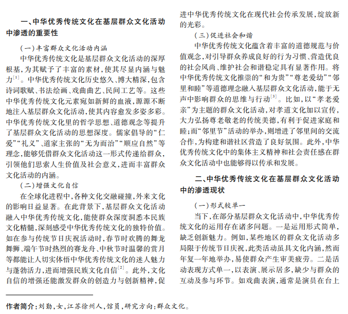 基层群众文化活动作为满足人民群众精神文化需求的有效途径,具有重要作用。本文深入探讨中 华优秀传统文化在基层群众文化活动中的融合,展示中华优秀传统文化在丰富基层群众精神生活、增强文化自 信及促进社会和谐进步方面所起的积极作用。
