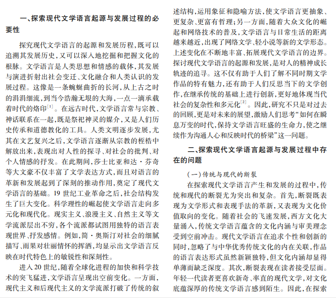 现代文学语言的产生和发展是复杂的文化现象,从文艺复兴时期的古典语言解放,到启蒙运动时 期的理性和自由表达,再到 20世纪后现代主义拓展语言的疆界,文学语言经历了一次又一次演化,呈现出丰富 多彩的表现方式和风格,深刻地反映了人类社会的历史进程和文化变迁。