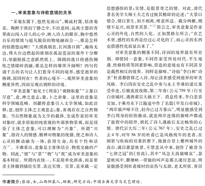 本文研究审美意象在诗歌创作中的角色扮演、审美意象与诗歌意境营造的关系,以及诗人对意象 的审美关照对诗歌创作的影响。创作主题对客观事物的移情和重塑是建构审美意象、实现主客体交融的灵魂, 也是营造意境的关键。