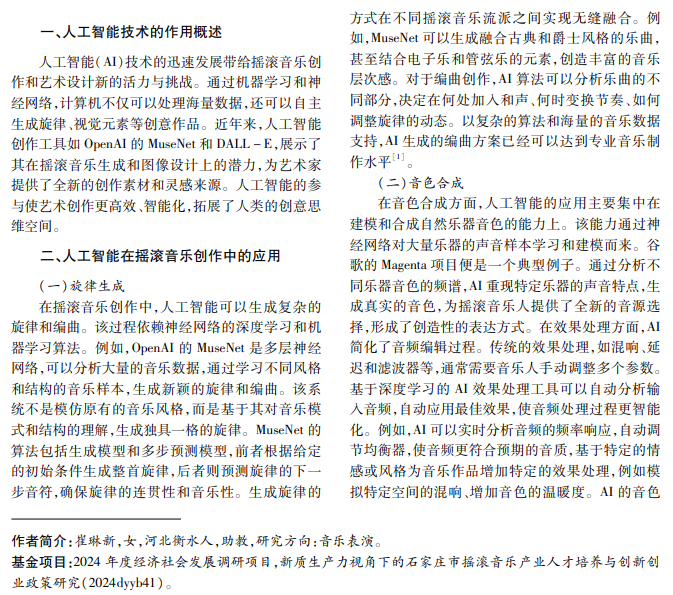 人工智能为摇滚音乐和艺术设计注入新活力,在旋律生成、音色合成、风格迁移等方面,丰富了创 作手段,提升了效率并激发了灵感。人工智能生成内容打破了传统审美边界,推动艺术创作多元化发展。人机 共生创作模式将成为趋势,艺术家与人工智能共同拓展创作边界,引领艺术进入崭新纪元。