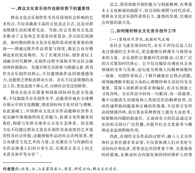 随着社会的发展与进步,群众文化音乐创作愈发重要。为满足群众精神文化需求,推动社会主义 文化繁荣,必须深入探讨群众文化音乐创作工作,包括支持原创音乐、促进交流合作、提高创作水平、倡导积极 向上的文化价值观等,确保群众文化音乐创作在新时代健康发展。