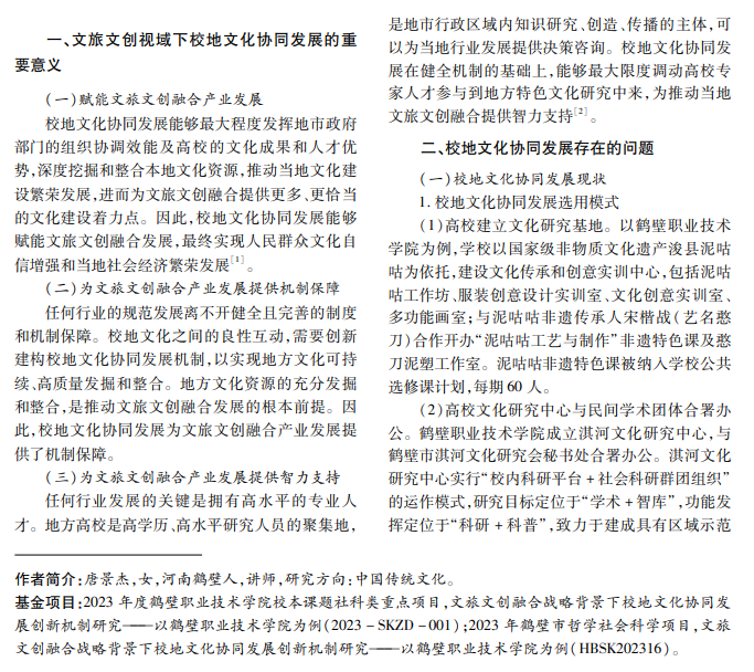 高校文化、地方文化是社会文化的核心部分,两者共生共荣,关系密切。本文基于文旅文创融合视 域,以鹤壁职业技术学院为例,深入研究校地文化互动现状和问题,分析其原因,以“点线面”的逻辑构建校地文 化协同发展框架,提出校地文化协同发展对策。