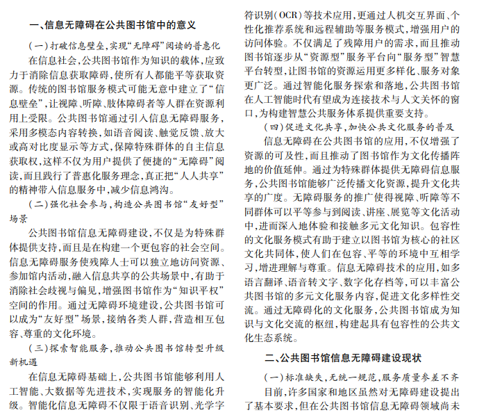 在人工智能迅速发展的背景下,公共图书馆应承担起为公众提供平等信息服务的责任。本文探讨 人工智能在公共图书馆无障碍建设中的应用,提出以用户体验为核心的无障碍服务方案,倡导以人机交互为核 心的服务标准设计,以更好地满足残障人士、老年人等群体需求,推动图书馆服务普惠化发展。