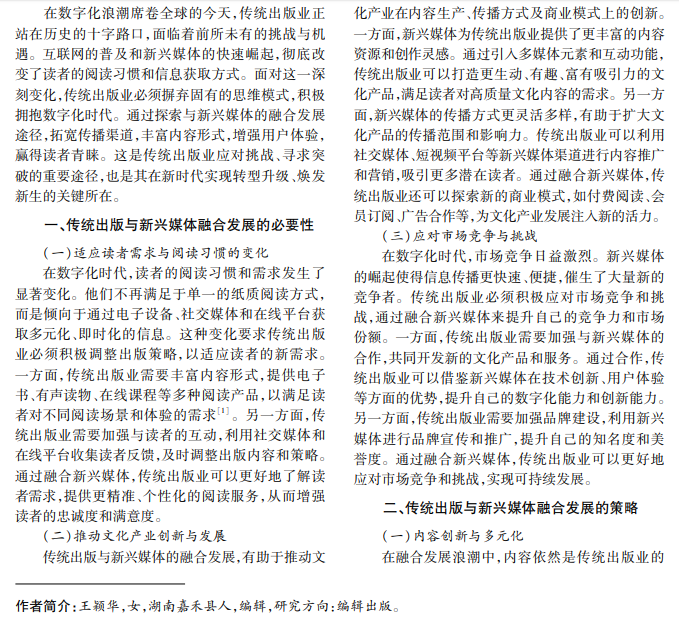 随着科技发展和互联网普及,读者的阅读习惯和信息获取方式发生了显著变化,给传统出版业带 来了前所未有的挑战。为适应这一变化,推动文化产业创新与发展,有效应对市场竞争,传统出版业必须积极 寻求与新兴媒体的融合发展。本文分析融合发展的必要性,提出六大融合发展策略,为传统出版业转型升级提 供理论参考。