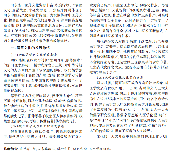 山东是儒家文化的发源地,儒家思想对儒医文化的形成产生了重要影响。本文探究儒医文化的内 涵、发展脉络,分析儒医文化的特征、局限和不足,揭示儒医文化对山东乃至全国中医药文化传承发展的影响和 启示。
