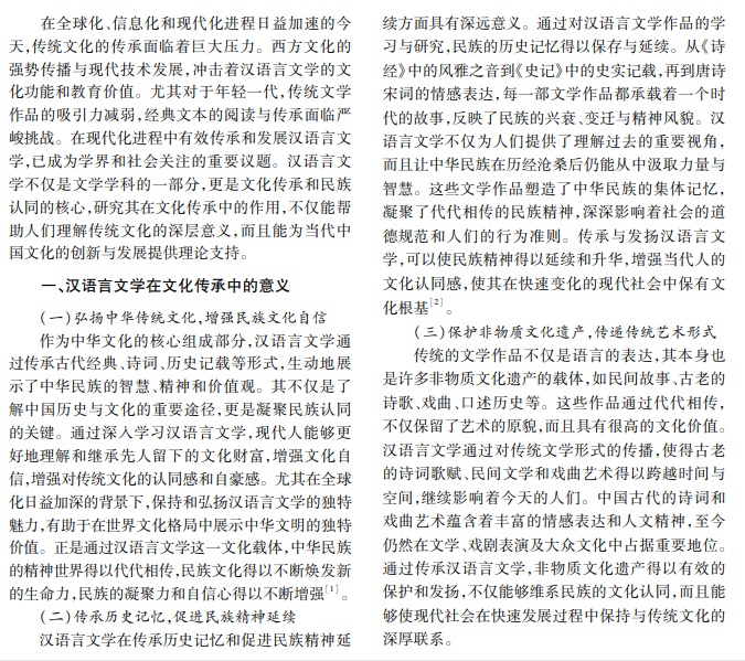 汉语言文学作为中华文化的重要载体,不仅承载着丰富的历史记忆,而且蕴含着伟大的民族精神。 汉语言文学在文化传承中的价值日益凸显,不仅是连接过去与未来的桥梁,更是维护文化多样性和文化自信的 关键。本文分析汉语言文学在文化传承中的价值和策略。