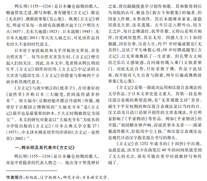 《方丈记》是日本隐者文学的巅峰之作,与吉田兼好的《徒然草》并称为日本中世随笔文学的双璧。 日本平安时代末期,出现了新的文体,即“和汉混合表现法”。《方丈记》是和汉混合表现法的第一部作品,在日 本文学史上具有重要意义,是现代日语文体(汉字假名混合)的源头。《方丈记》的文体、无常观、危机意识对后 世产生了深远影响。本文介绍作者鸭长明的生平及《方丈记》创作经纬,分析《方丈记》中的五大灾害及作者的 草庵生活,最后探讨《方丈记》的借鉴与影响,揭示《方丈记》的现代意义。