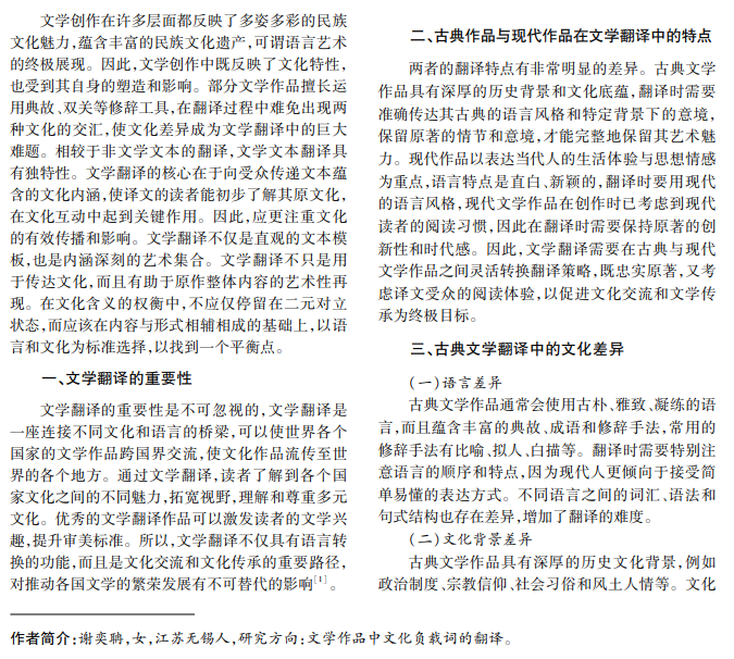 语言是文化的载体,每种语言都蕴含该地区、该民族的文化,文化交流通过语种间翻译艺术体现。 文化差异是文学翻译中最难掌握的部分,本文从文学翻译的角度探讨文化差异产生的原因,介绍古典与现代作 品文学翻译特点,探讨古典文学翻译中的文化差异,分析现代文学翻译中的文化差异,提出应对差异的策略。