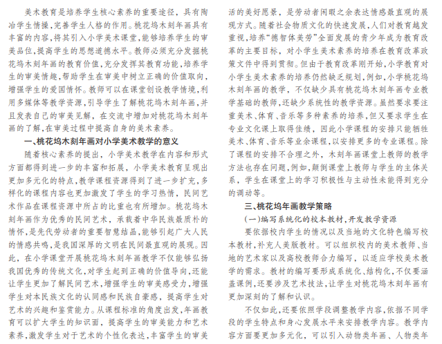在核心素养的教育背景下,美术教育有着重要作用,能够陶冶学生情操,完善学生的人格。桃花坞木刻年 画作为一种优秀的民间艺术能够提高学生的审美品位,帮助学生树立正确的价值观。本文探讨了桃花坞木刻年画对小 学美术教学的意义,并进一步分析了桃花坞年画的教学策略,指出必须编写系统化的校本教材,开发教学资源,使用多 元的教学方法,丰富创作主题。