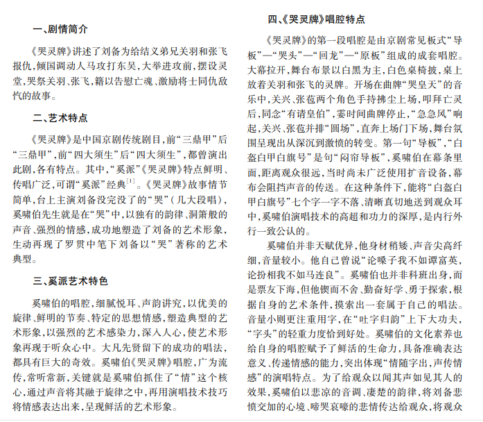 《哭灵牌》是京剧“四大须生”之一奚啸伯最具代表性的作品,该作品巧妙地将声韵赋予唱腔,唱腔 独具风格,情感强烈,情随字出,以声传情,形成清新典雅、缠绵委婉、错骨不离骨的艺术风格,表现如泣如诉、实 唱似说、鲜活浓郁的艺术气息。
