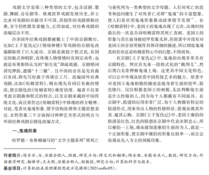 京剧《王子复仇记》是对莎士比亚戏剧《哈姆雷特》的京剧化改编。作为两种不同的艺术表演形式, 外国经典戏剧与现代京剧在特点和舞台表演上有所不同,本文以《哈姆雷特》和京剧《王子复仇记》为例,从鬼魂 形象、情节结构处理和主题思想表达及女性形象等方面探讨两种艺术形式的特点与改编方式,为外国戏剧改编 提供借鉴。