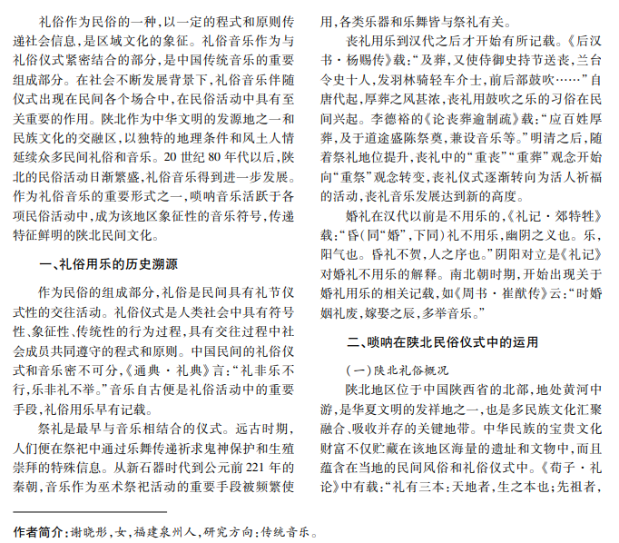 礼俗仪式作为民众自发性的社会活动,自古便有用乐传统。礼俗音乐是仪式的重要成分,与仪式 相伴而生。陕北地区因地理、人文等诸多优势留存大量民间礼俗,唢呐音乐作为当地礼俗音乐的主要形式发展 至今。本文以陕北礼俗仪式中的唢呐音乐为研究对象,梳理其在仪式中的运用,探讨其社会功效。