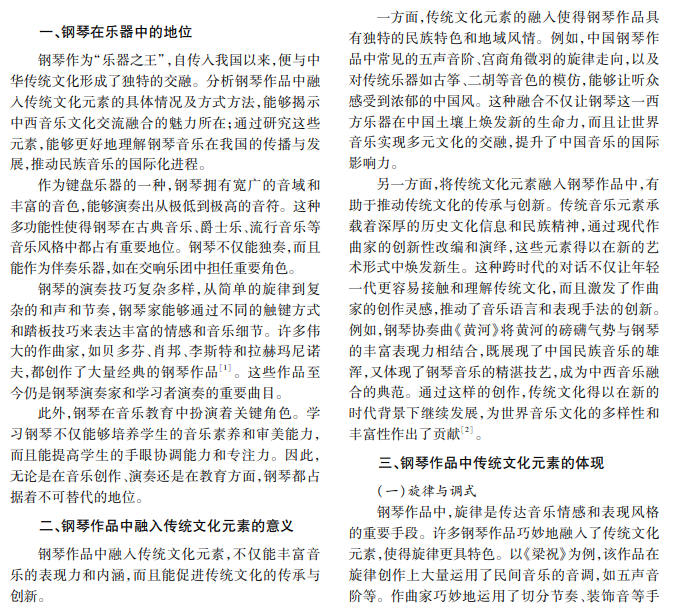 钢琴被称为“乐器之王”,钢琴的独特音色和良好的融合性,使其在各类音乐活动中大放异彩。本 文结合钢琴作品展开分析,探讨传统文化元素融入钢琴演奏的策略。