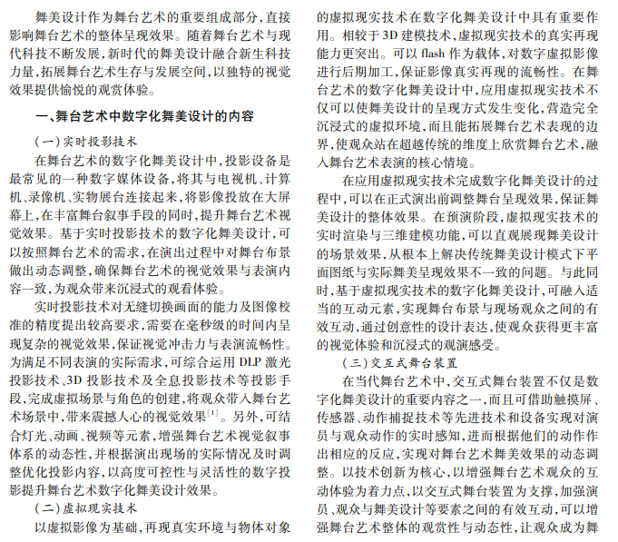 为展现舞台艺术的独特魅力,可合理应用技术手段,进行数字化舞美设计。本文以传统舞美设计 为基础,分析实时投影技术、虚拟现实技术、交互式舞台装置等数字化舞美设计在创新表现形式、丰富叙事表 达、加强观众互动中的应用,推动数字技术与舞美设计跨界融合。