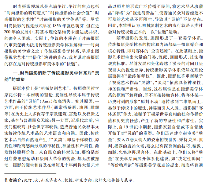 本文从消除对艺术“灵韵”的重塑、突破图像审美规范两个角度入手,通过论述图像视效、与大众审 美结合的必然性以及视觉心理学等多个层面,综合阐释时尚摄影对传统摄影美学体系的“怯魅”过程,探讨时尚 摄影审美逻辑对现代摄影美学体系的影响及其在时尚摄影创作中的作用。