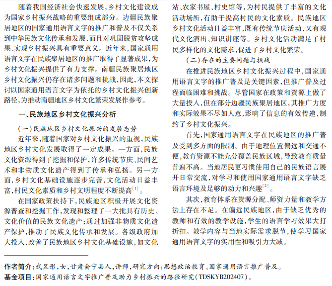 本文聚焦边疆民族聚居地区乡村文化振兴,以国家通用语言文字为支撑,探讨创新路径。研究发 现,国家通用语言文字在提升教育水平、促进文化传承创新方面发挥关键作用。通过结合语言政策、挖掘文化 资源、发展文化产业和促进文化交融等创新路径,以及完善政策体系、加强教育培训等措施,可推动乡村文化繁 荣。本研究为乡村文化振兴提供理论与实践参考。