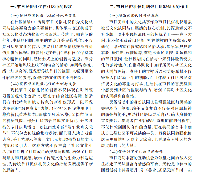 本文通过分析传统节日民俗礼仪的传承与变迁、现代节日民俗礼仪的创新与发展,揭示节日民俗 礼仪在强化文化认同、促进邻里交往、增强社区规范等方面的重要作用。面对现代化、城市化和全球化带来的 挑战,本文提出基于节日民俗礼仪增强社区凝聚力策略。