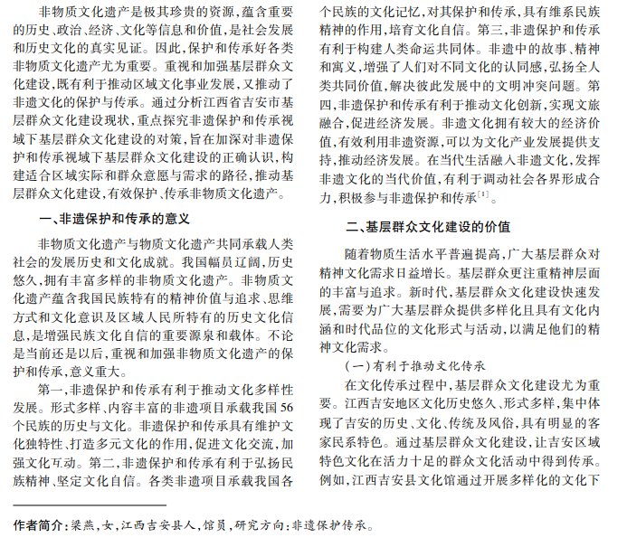 中国文化源远流长,在历史长河中孕育和遗留下来的非物质文化遗产丰富多彩、博大精深,是宝贵 的文化资源,需得到保护与传承。群众文化建设是满足群众精神文化需求的现实路径,重视和加强基层群众文 化建设,既有利于推动区域文化事业发展,又能推动非遗保护与传承。