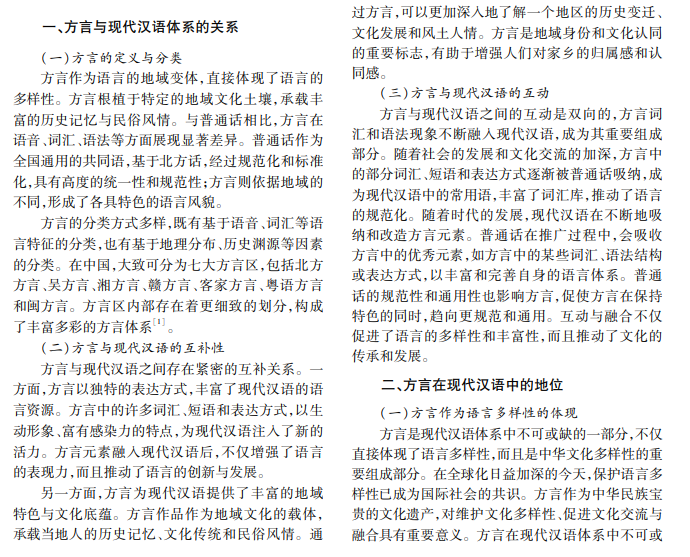 本文分析方言在现代汉语中的地位与价值,强调其作为语言多样性的重要组成部分,对现代汉语 的丰富与发展具有深远影响。方言不仅丰富了现代汉语的语言表达与文化内涵,而且在文学、艺术及社会交流 中展现了独特魅力。面对方言保护的挑战,探索方言与普通话的和谐共生路径,对促进现代汉语的健康发展具 有重要意义。