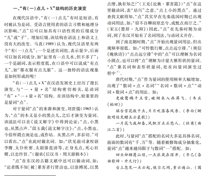 在现代汉语中,“有(一)点儿”语法结构的使用频率极高,有时作为短语使用,有时作为副词使用, 其中的数词“一”常常被省略。本文从“有(一)点儿 +X”结构的历史演变角度出发,论述“有(一)点儿 +X”中 数词“一”省略的条件与原因,着重讨论 X为名词性短语时的情况。研究发现,数词“一”省略的原因与汉语韵 律特点及不定量词“点”有关。