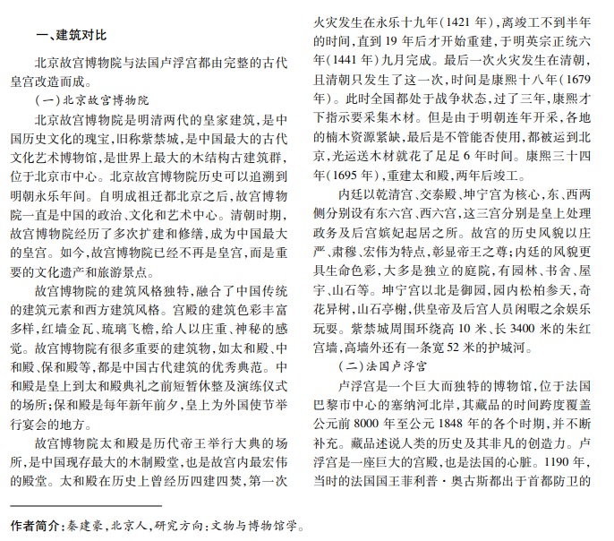 博物馆是为社会服务的非营利机构,向大众开放,为研究、教育、欣赏之目的,征集、保护、研究、传 播并展示人类及人类环境的见证物。本文通过对比北京故宫博物院和法国卢浮宫的藏品、建筑风格及镇馆之 宝,旨在引发中西博物馆对比与分析的思考。