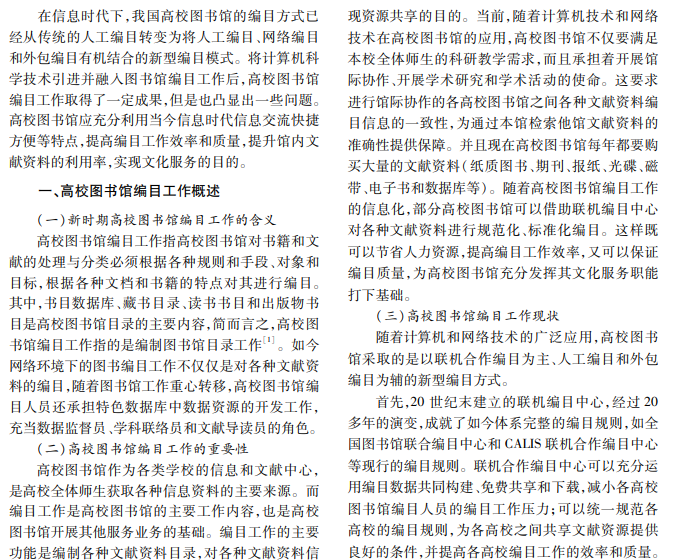 本文阐述高校图书馆编目工作的含义、现状及重要性,探究高校图书馆编目工作存在的问题,提出 提高图书馆编目工作效率和质量的措施。