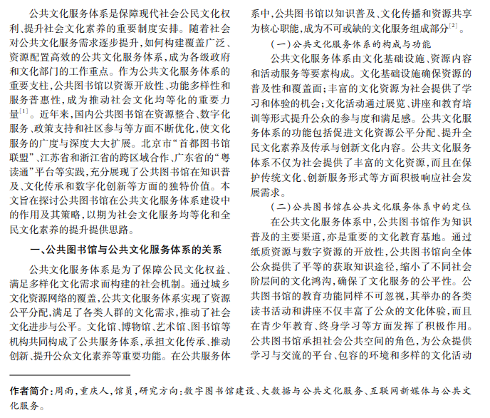 公共图书馆作为公共文化服务体系的核心组成部分,承担知识普及、资源共享和社会教育等多重 功能。本文重点探讨公共图书馆在知识传播、文化教育、资源共享及数字化服务等方面的重要角色,结合实际 案例和相关数据,从资源整合、服务创新、数字化转型、政策支持以及社区参与五个方面分析公共图书馆在公共 文化服务体系建设中的策略。