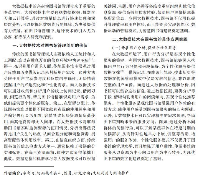 目前,大数据技术在各领域的应用日趋成熟,给传统的图书馆管理模式带来了深远影响。随着用 户需求的多元化和信息资源的快速增长,如何提升图书馆管理效率成为亟待解决的问题。本文通过探讨大数 据技术在图书馆管理中的应用潜力,提出创新对策,以期为图书馆实现智能化、个性化服务提供参考。