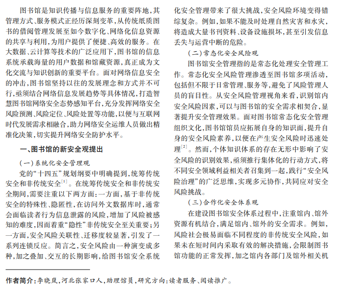 在计算机网络、信息技术飞速发展的当下,网络安全问题愈发突出。作为国内主要文化场馆之一, 多数图书馆配备了信息系统,为用户获取信息提供便利,但也引发了一系列安全性问题。本文阐述图书馆的新 安全观、图书馆网络信息安全的关键点,分析图书馆网络安全威胁,最后从多个视角总结图书馆管理信息系统 建设及安全防护策略,以供参考。