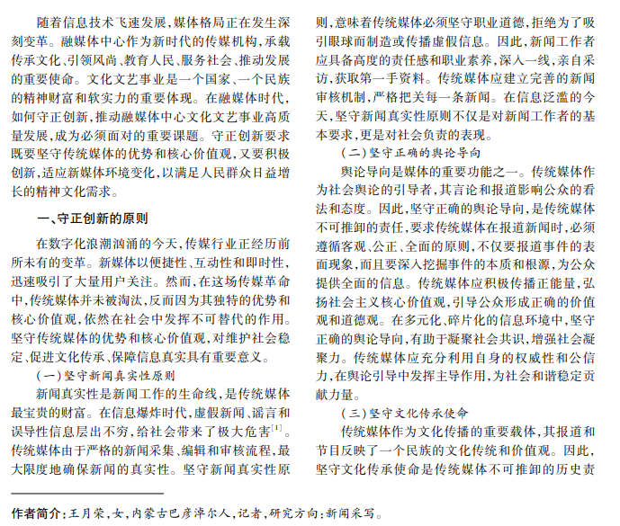 在融媒体时代背景下,推动文化文艺事业高质量发展,关键在于守正创新。本文从融媒体中心角 度出发,探讨如何在新时代背景下坚守文化文艺事业的正确方向。通过分析融媒体中心发展,结合文化文艺事 业特点与需求,提出一系列具有可操作性的策略与建议,旨在以创新方式推动融媒体中心文化文艺事业迈向新 高度。