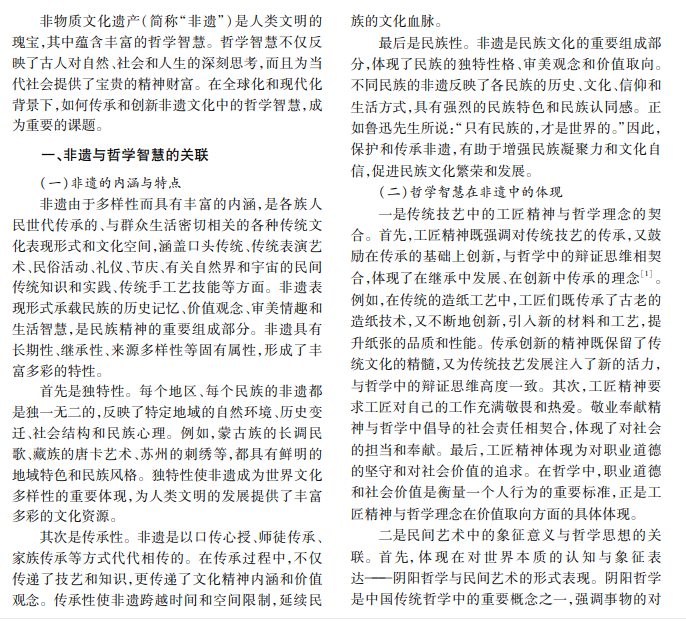 本文深入探讨非遗蕴含的哲学智慧,分析其在传承与创新中的价值与挑战,通过对当前多个非遗 项目的研究,提出在当代社会中传承和创新非遗哲学智慧的策略与方法。