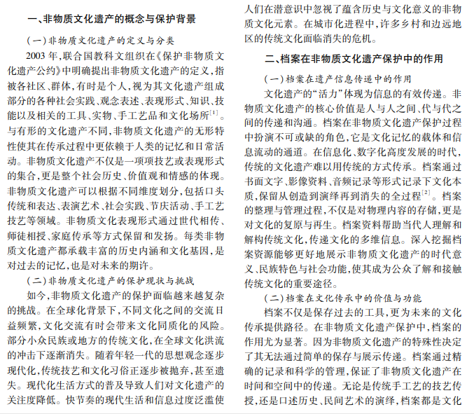 档案在非物质文化遗产传承中占据核心位置,是文化记忆不可或缺的重要载体,记录了非遗文化 的历史轨迹与变迁,为后世研究、保护及传承提供了宝贵且丰富的资料基础。档案不仅巩固了非物质文化遗产 的真实性和连续性,更成为激发传承人创新灵感的源泉,助力非遗文化的活态传承与持续发展。