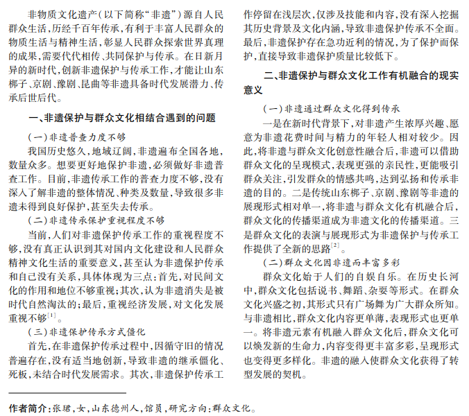 非物质文化遗产是人类文化多样性的重要组成部分,具有历史积淀和文化传承的价值。非遗保护 与群众文化工作结合,既是传承文化的重要途径,也是促进社会发展和文化繁荣的重要策略。鉴于此,本文深 入探讨非遗保护与群众文化存在的问题,提出解决方案,以期为非遗保护与群众文化工作的结合提供参考。