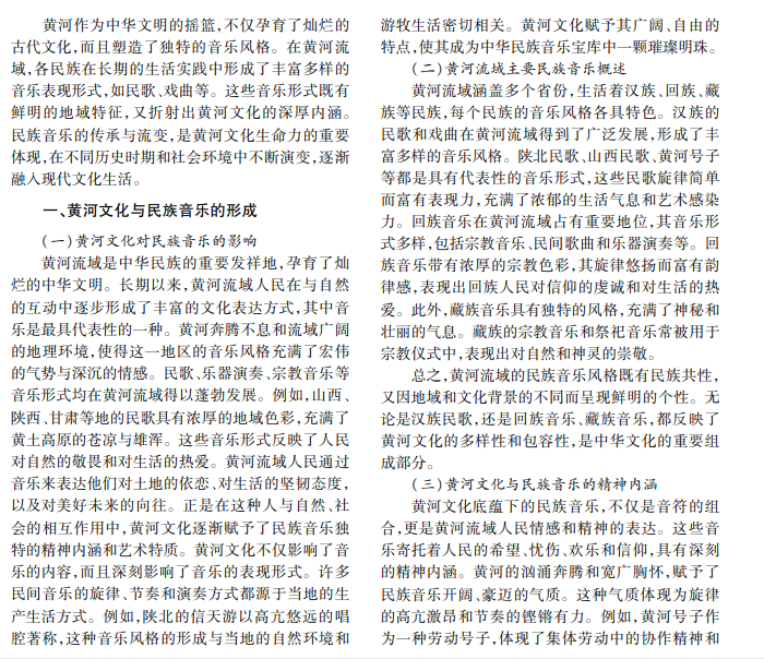 黄河文化是中华文化的重要组成部分,其深厚的历史底蕴孕育了独特的民族音乐,体现中华民族 的多样性和创造力。本文以黄河文化为背景,探讨民族音乐的传承与流变过程,分析其在现代社会的发展路径 及未来前景,揭示其文化价值和艺术魅力。