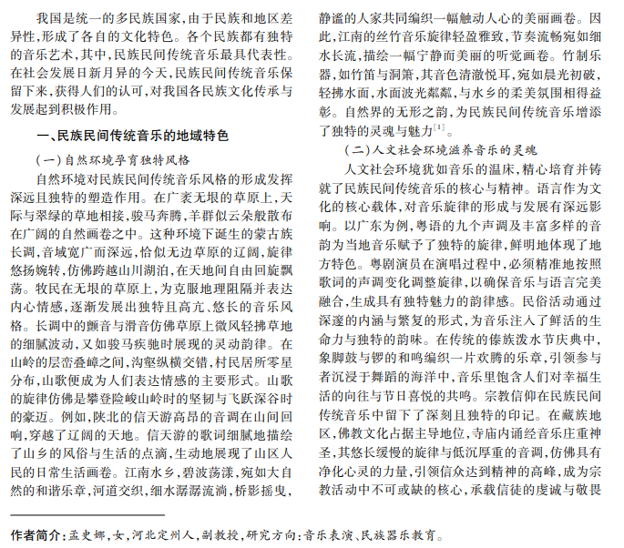 民族民间传统音乐是民族文化重要组成部分,在漫长的历史中经历了无数次融合与变迁,体现出 多元化、多样化样态。随着现代化进程加快,民族民间传统音乐受全球文化冲击与影响,逐渐被边缘化,在一定 程度上制约了民族民间传统音乐的发展。基于此背景,本文研究民族民间传统音乐的地域特色与多元融合。
