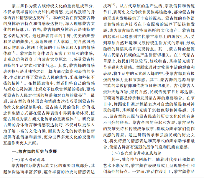 本文深入探讨蒙古舞蹈中身体语言与情感表达的技巧,揭示其独特的艺术魅力与文化价值。在身 体语言方面,分类总结蒙古舞动作类型,阐释动作姿态和舞蹈空间利用的特点;在情感表达方面,探讨情绪与节 奏的交融、表达技巧的演进与创新,着重分析各种因素在舞蹈视觉效果中的应用,为研究民族舞蹈提供新视角。