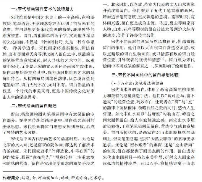 宋代绘画留白思想是中国传统美学精髓。本文从山水画、花鸟画、人物画入手,研究留白在构图、 意境、笔墨中的内在规律,阐明其“虚实相生、师法自然、含蓄蕴藉”的美学特质,展望通过数字媒介重构、跨学科 融合、文化创意转化、元宇宙探索等路径,实现留白思想的创新传承与发展,为中国美学体系建构、艺术创作实 践提供启示。