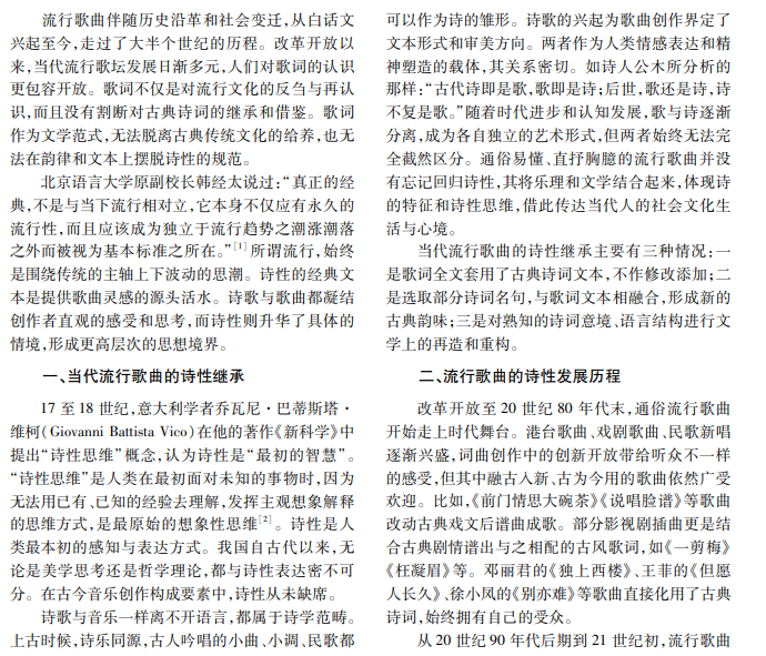 历史上,诗词与音乐的关系十分密切。自古以来,诗歌“谱曲可唱,离谱能赏”,歌曲表达的主题思 想离不开诗词。改革开放以来,当代流行歌曲创作仍未脱离诗性表达的传统,在传承诗性意境时,亦发展出自身 的审美体系。本文从流行歌曲的诗性传统、诗性特点和诗性表达意义三个方面探讨当代流行歌曲的诗性表达。