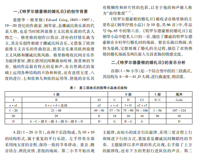 格里格的钢琴抒情小品《特罗尔德豪根的婚礼日》,是一首具有浓厚民族风情的钢琴曲,充满欢乐、 神秘和祝福的情感。本文选取该曲为研究对象,详细分析其演奏部分,解读格里格的音乐风格和创作手法,为 演奏格里格作品提供指导参考。