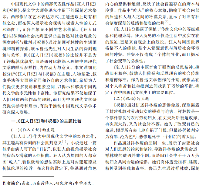《狂人日记》《祝福》均为鲁迅作品中的经典,在中国现代文学中占据重要地位。《狂人日记》以狂 人视角批判社会疾病与人性扭曲;《祝福》通过祥林嫂的命运展现旧社会劳动妇女的悲惨生活,强调人性尊严 与精神自由。《狂人日记》揭社会弊,显鲁迅反思;《祝福》探人性深,展民生关怀。本文对两者展开比较性阅 读研究。