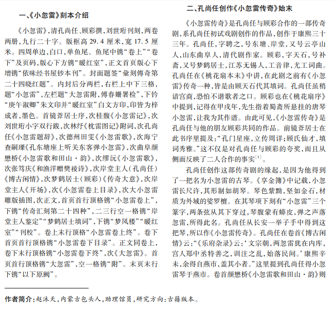 清代藏书家刘世珩刊刻的传奇剧本《小忽雷传奇》,是由清代戏曲作家孔尚任与顾彩联合创作的, 也是孔尚任创作的第一部传奇剧。《小忽雷》剧本自孔尚任完成后,一直以抄本形式流传于世,直到藏书家刘世 珩收得《小忽雷》抄本,才将其刊刻行世。本文通过分享《小忽雷传奇》的成书过程,介绍清代戏曲作家孔尚任的 创作过程与藏书家刘世珩的刊刻活动。