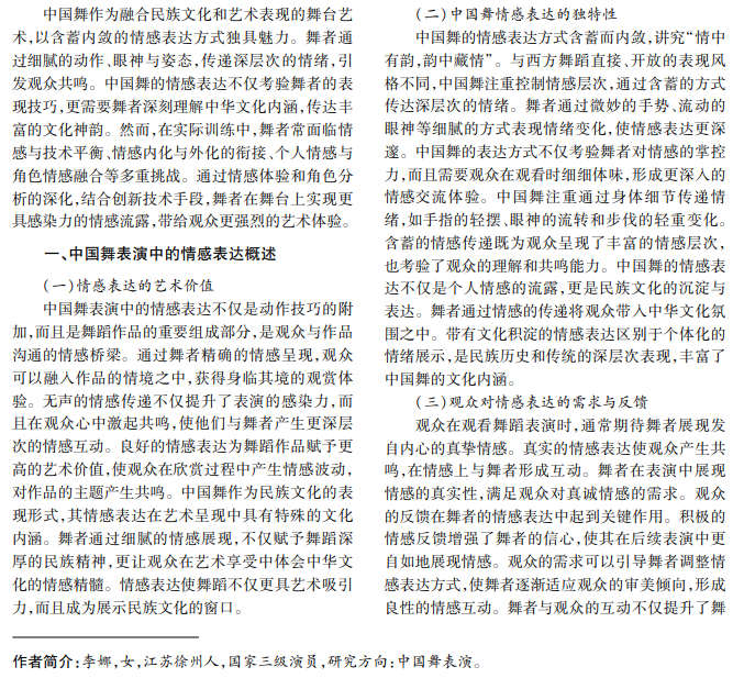 中国舞以独具民族特色的艺术风格和丰富的文化内涵,在舞台上表现高度的情感张力。舞者通过 情感表达,不仅展现了舞蹈的美感,更在表演中与观众形成深层的情感共鸣。本文探讨情感表达在舞蹈作品中 的具体应用,分析不同风格舞种中的情感适应性与创新训练带来的成效,以期为舞者提供科学的情感表达路 径,提升中国舞艺术表现力。