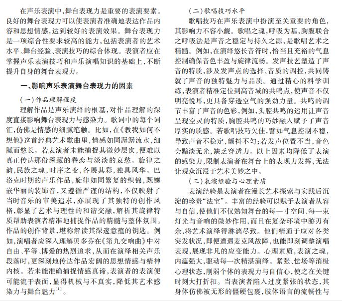 在声乐表演中,舞台表现力是表演者必须具备的重要素质之一。本文介绍舞台表现力的概念和影 响因素,分析舞台表现力在声乐表演中的重要意义,阐述如何提升声乐表演者的舞台表现力,希望对广大声乐 表演者有所帮助。